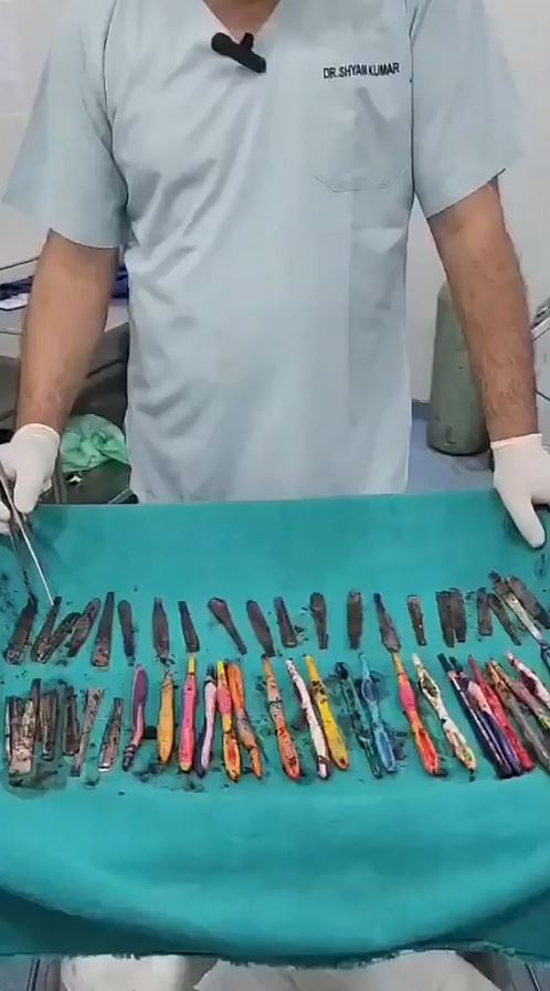 Во еден од најбизарните медицински случаи забележани досега, тим на хирурзи во индискиот град Хапур, од стомакот на 39-годишен маж извадиле неверојатна колекција на предмети: 29 лажици, 19 четки за заби и две пенкала. Неговото објаснување за тоа како предметите завршиле таму е подеднакво шокантно и тажно.