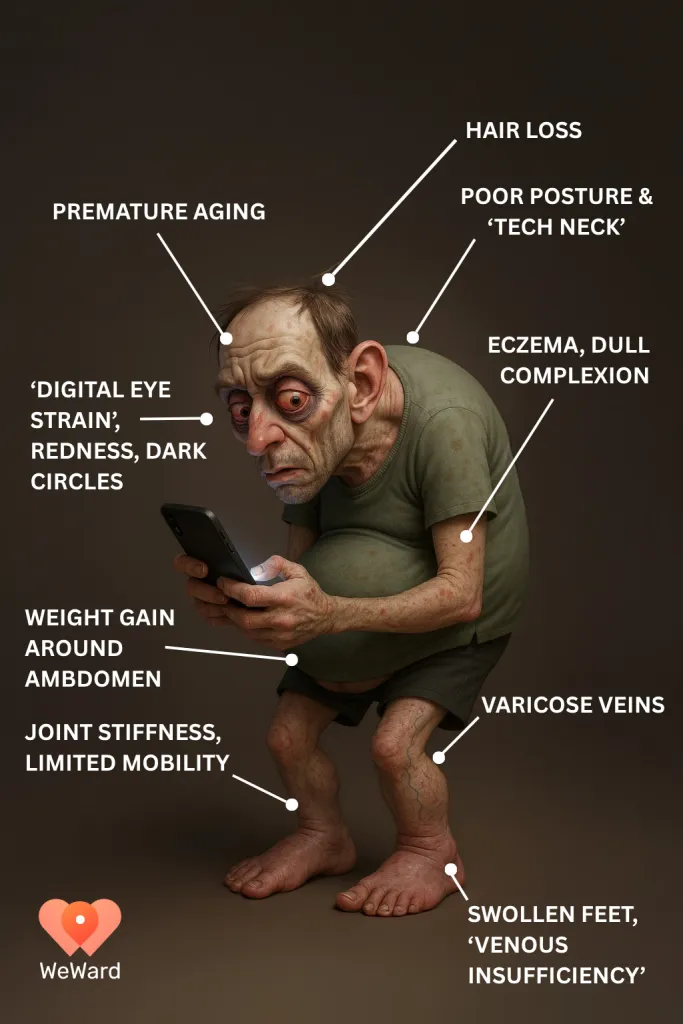 Објавениот приказ е направен како медицинска проекција која покажува како физичката неактивност влијае на изгледот и здравјето. Според податоците на СЗО, дури 80% од тинејџерите не го исполнуваат минималното ниво на физичка активност, пренесува New York Post. „Во денешната култура на удобност, сè – од нарачување храна до работа и дружење – го извршуваме од фотелја“, наведуваат од компанијата WeWard.
